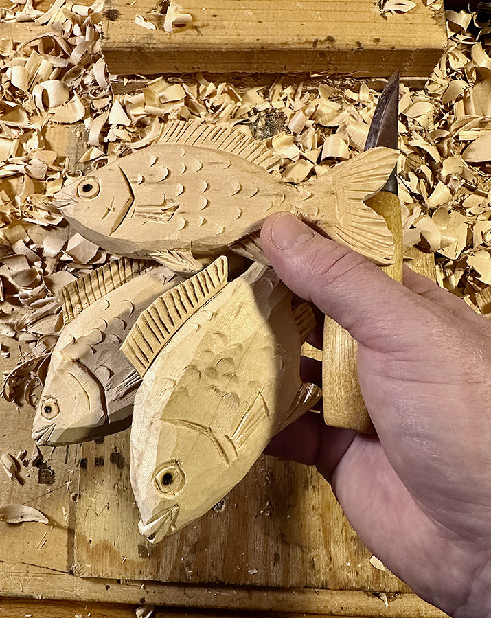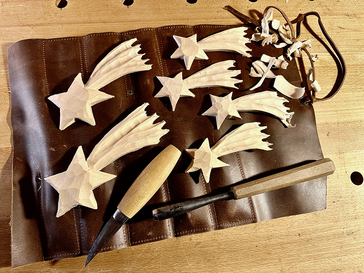 Ručně vyřezané vánoční ozdoby z lipového dřeva.